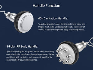 - 40k Cavitation Handle: This handle targets stubborn areas such as the abdomen, back, and thighs, using cavitation at a frequency of 40 kHz to achieve outstanding body contouring results.