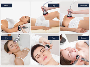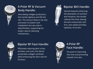 - 6-Polar RF & Vacuum Body Handle: This handle stimulates collagen production, tightening and lifting the skin. The vacuum feature not only boosts circulation and metabolism but also aids in detoxification, supporting the body's natural cleansing processes.