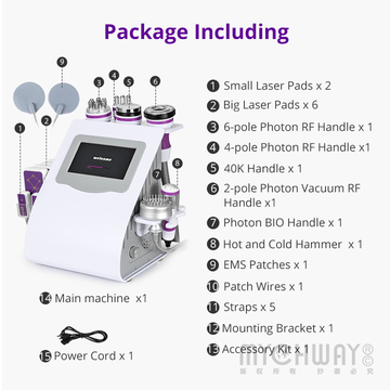 High-Quality 10 In 1 Ultrasonic Cavitation 2.0 Vacuum Body Slimming Skin Care Spa Machine is one of the cavitation rf body face lifting machines in MyChway. It is mainly helpful to body slimming, fat burning, skin lightening, face lifting, etc. There are 40K cavitation handle, body vacuum RF handle, face RF handle, body RF handles, microcurrent & photon handle for facial lifting, cold hammer, EMS pads, and lipo laser pads.