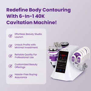 - Seamless Launch into the Beauty Business: Ready to kickstart your dream beauty studio? Dive into the world of affordable entrepreneurship with our 6 in 1 Ultrasonic Cavitation Machine! Picture this: 5 handles, 8 LED pads, and a promise of incredible results that will keep your clients coming back for more.