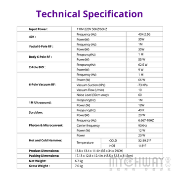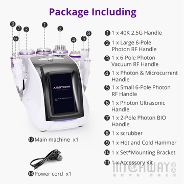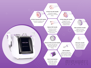 - 6-Polar Face RF Handle: Tightening collagen and encouraging collagen renewal, this handle lifts and firms facial skin, addressing concerns related to sagging facial skin.