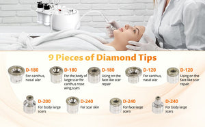 The package comes with 9 kinds of replaceable diamond tips, each with a different texture and shape, which can be applied to different areas of the body or face, and different diamond tips can be selected according to the user\'s needs. D120 and D180 are for the body, especially for acne, knee, elbow areas, and striae of pregnancy. D180 and D240 is for the face, for the large blemishes. D120, D180, and D240 are for scares, fine lines, and imperfections. D200, and D240 is for the eyes and both sides of the nose, for wrinkles, oil tablets, blackhead, and acne.