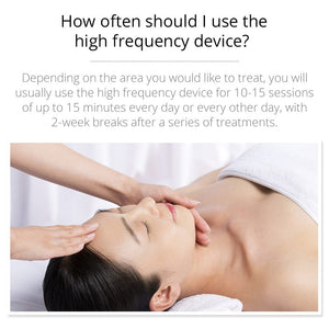 Direct high frequency boosts activity in the skin's basal layer, refines texture, and improves defense against bacteria with its germicidal and antibacterial ozone effects. It reduces sebaceous secretions, dries, and heals pustular infections by dilating pores to release impurities. Enhanced detoxification and circulation results in better skin texture and oil-moisture balance. There are no harmful effects on nerves or muscles as no chemicals are driven into the skin. Indirect high frequency produces a relaxing, sedative effect, relieving tension with the same benefits as direct high frequency.