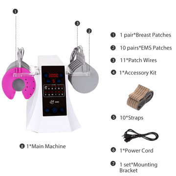 EMS Pads: Emit electronic pulses to target specific body points, exercising muscles and breasts, relieving pain, promoting circulation, boosting metabolism, firming skin, and enhancing breast appearance.