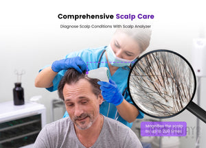 Magnifies the scalp by up to 200 times for a detailed assessment of scalp health, helping to identify blocked follicles, excess oil, and dandruff. This serves as a basis for tailored scalp treatments.