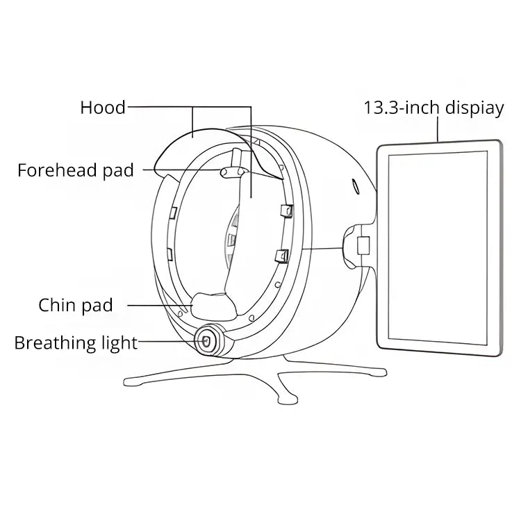 Technical PrinciplesThis skin analyzer captures high-definition images of facial skin using industrial-grade high-definition effects with eight different light sources, including white light, positive polarized light, negative polarized light, UV light, blue light, Wood's light, brown light, and red light. It utilizes advanced technologies such as spectral imaging, AI face recognition, deep learning, 3D skin simulation, and cloud computing/storage to perform a quantitative analysis of both surface and deep skin features. This comprehensive assessment covers 14 key skin health indicators, providing precise insights for scientific and accurate skin management. |